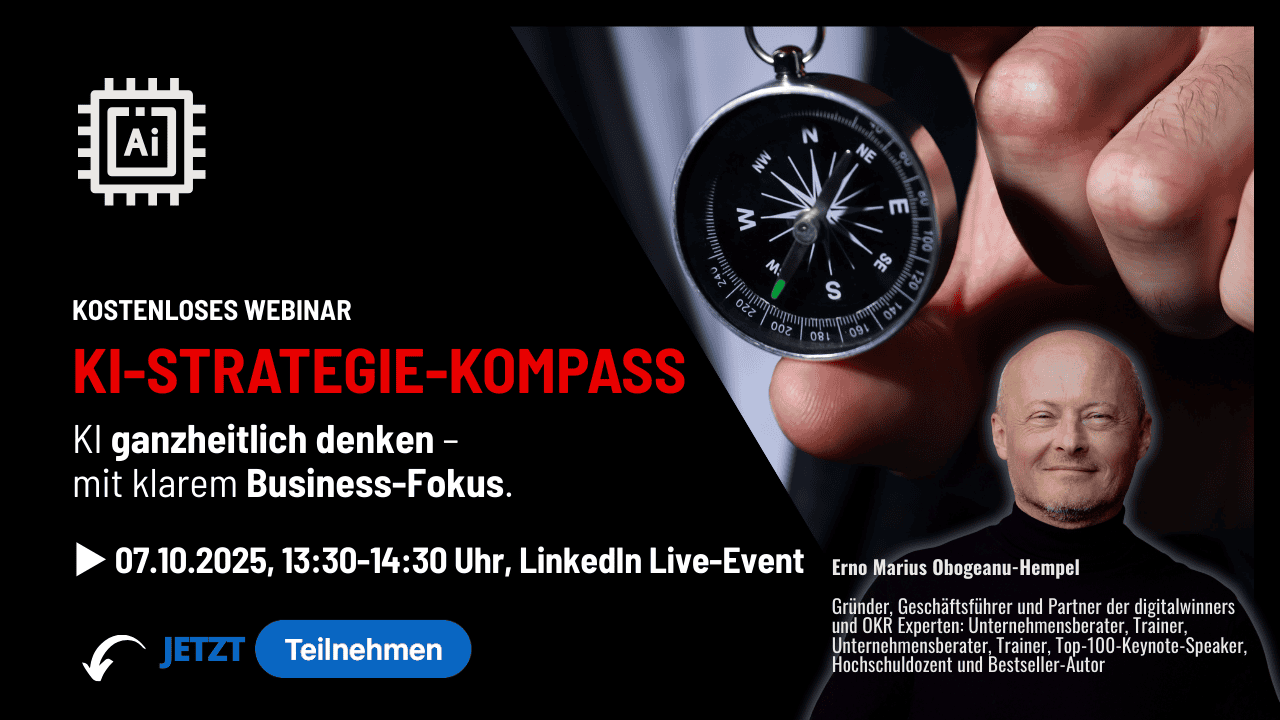 Für wen? Für Führungskräfte, Entscheider, Innovations- und Digitalverantwortliche sowie Team- und Bereichsleiter, die KI mit klarem Business-Fokus wirksam einsetzen wollen. Nicht für Beratungen, Berater oder Coaches.